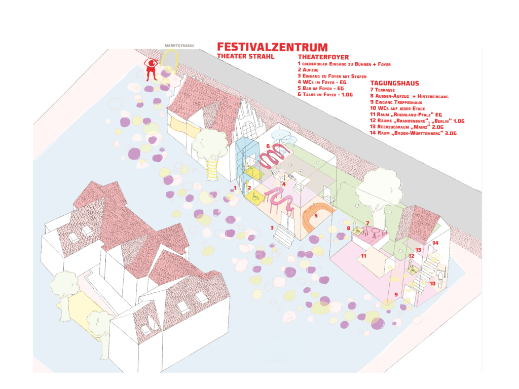 Wir freuen uns natürlich, dass wir uns in diesem Jahr wieder persönlich begegnen können – dennoch haben wir zwei Elemente aus dem letzten Festival übernommen: Unter diesem Beitrag findet ihr die von Teresa Mayr gezeichnete Übersicht unseres Festivalzentrums Theater Strahl Ostkreuz. Und könnt ihr euch erinnern, woran ihr 2021 Mitglieder des Teams in gather.town erkannt habt? Wir hatten alle gelbe Caps auf. Nun – daran erkennt ihr uns auch in diesem Jahr!