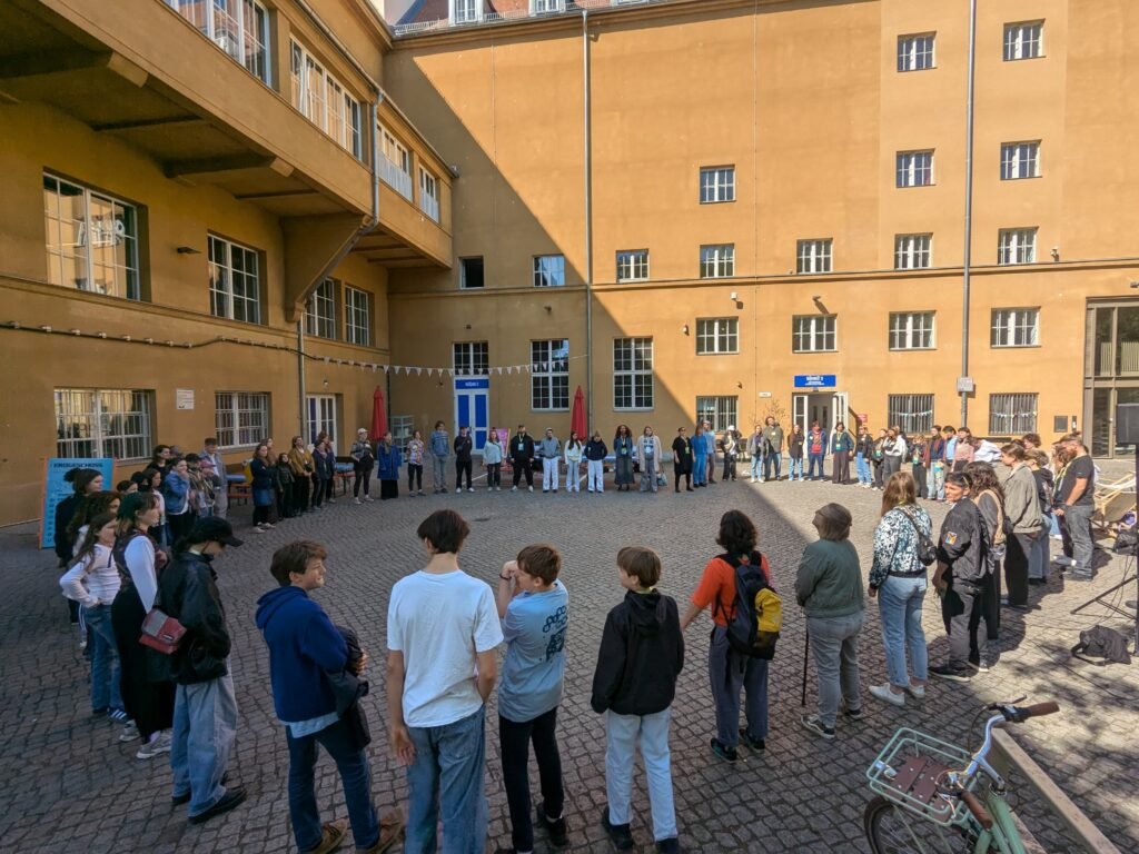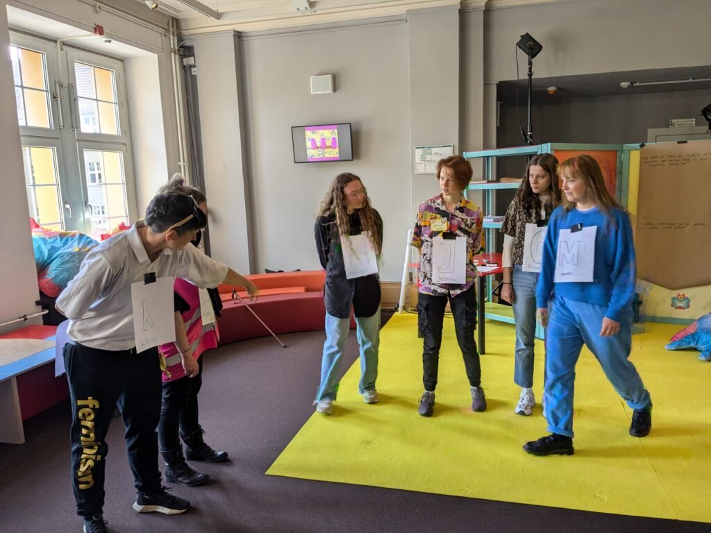 10:48 Uhr - Vier parallel laufende Workshops bilden das Herzstück des Vormittags. Von Studierenden der Universität Hildesheim sind im Rahmen eines Uni-Seminars Nachgespräche zu den AUGENBLICK MAL!-Gastspielen vorbereitet worden. Im Nachgespräch zu “Wolf” bewegen sich die Teilnehmenden frei durch den Raum und sinnieren über vorbereitete Fragen: Welche Szene der Inszenierung ist euch besonders in Erinnerung geblieben? Was hat das Bühnenbild bei euch ausgelöst? Mit welchen Gedanken habt ihr die Vorführung verlassen? “O (die shOw)” wird ebenfalls kreativ nachbereitet: Alle Teilnehmenden haben ein Schild mit ihrem Anfangsbuchstaben auf dem Bauch kleben. Genau wie in der Inszenierung sollen daraus möglichst vielfältige Wörter gebildet werden.